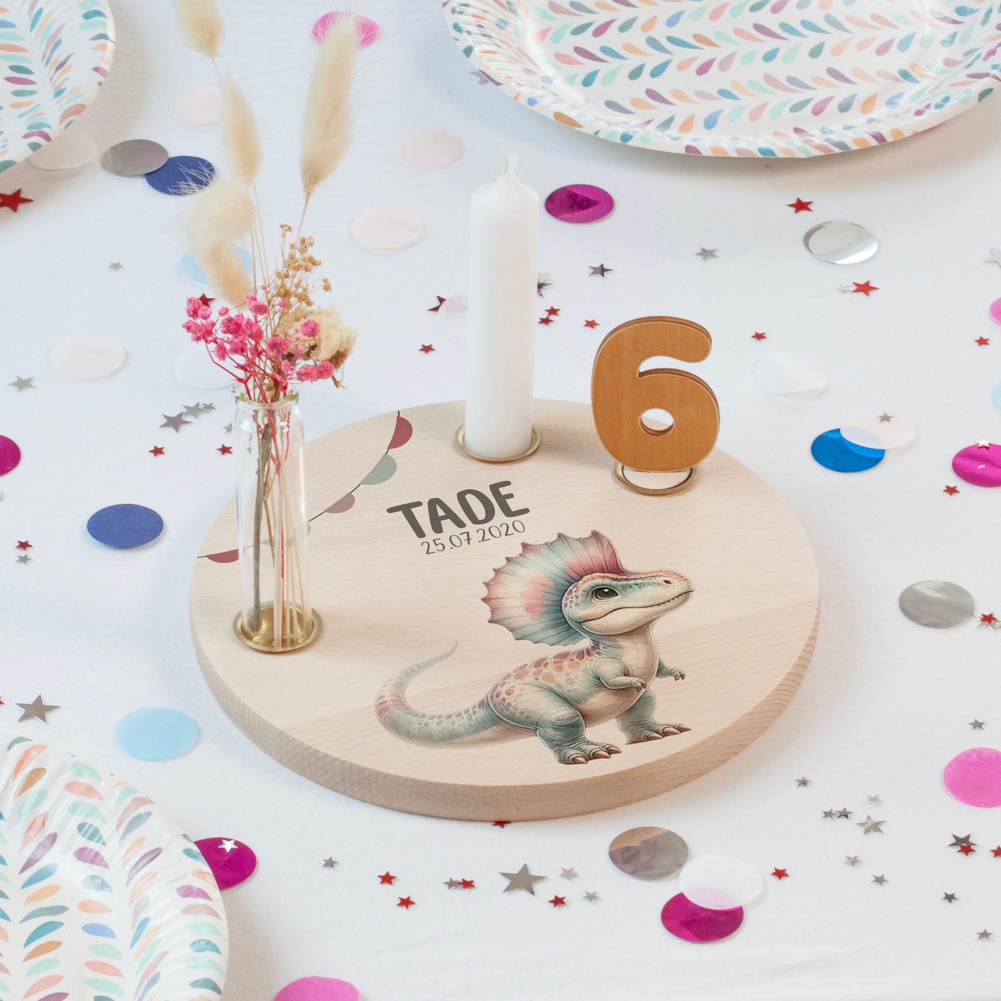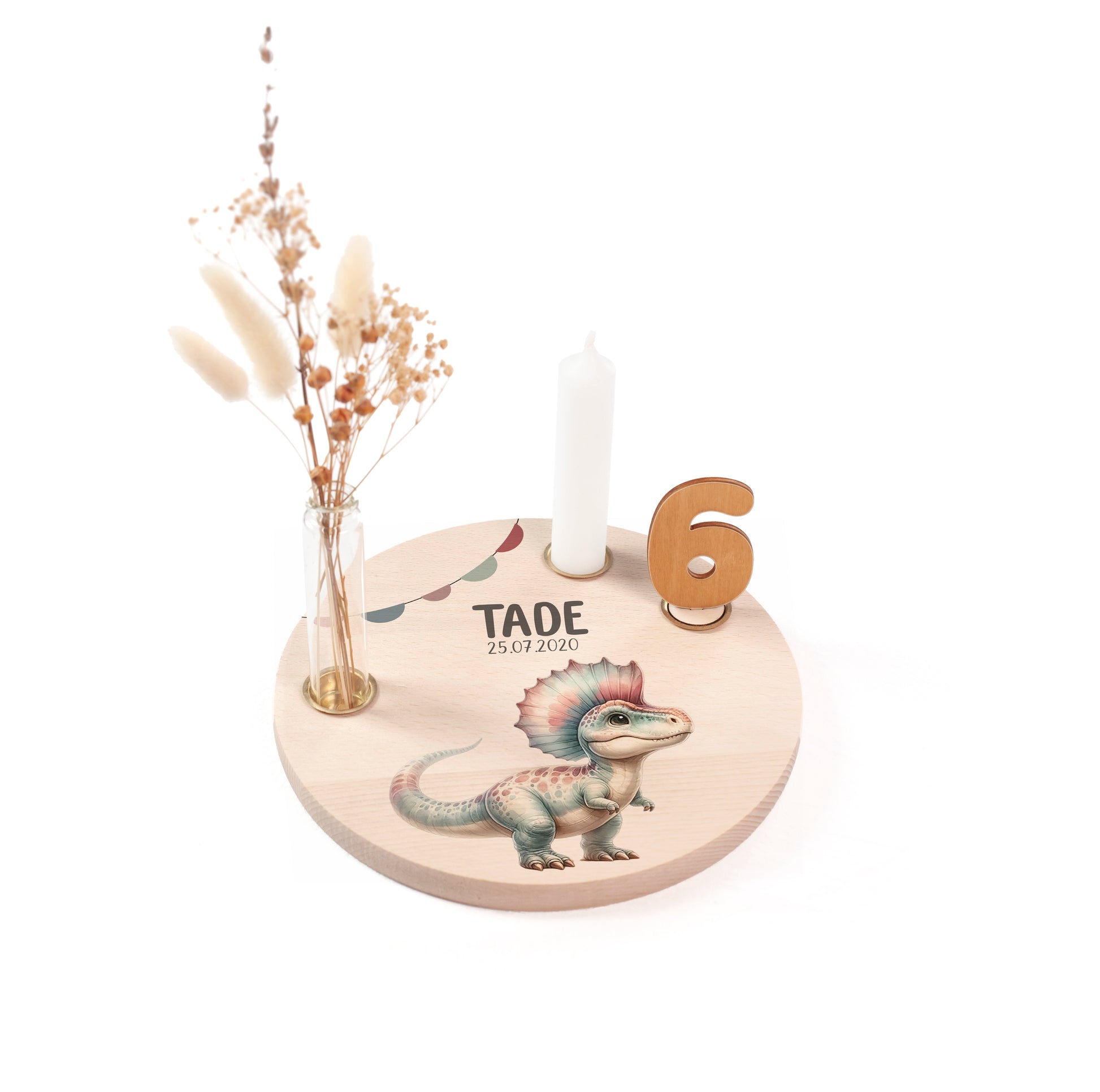 personalisierter Kerzenteller mit Kerze, Vase und Zahlen (Dino 5)