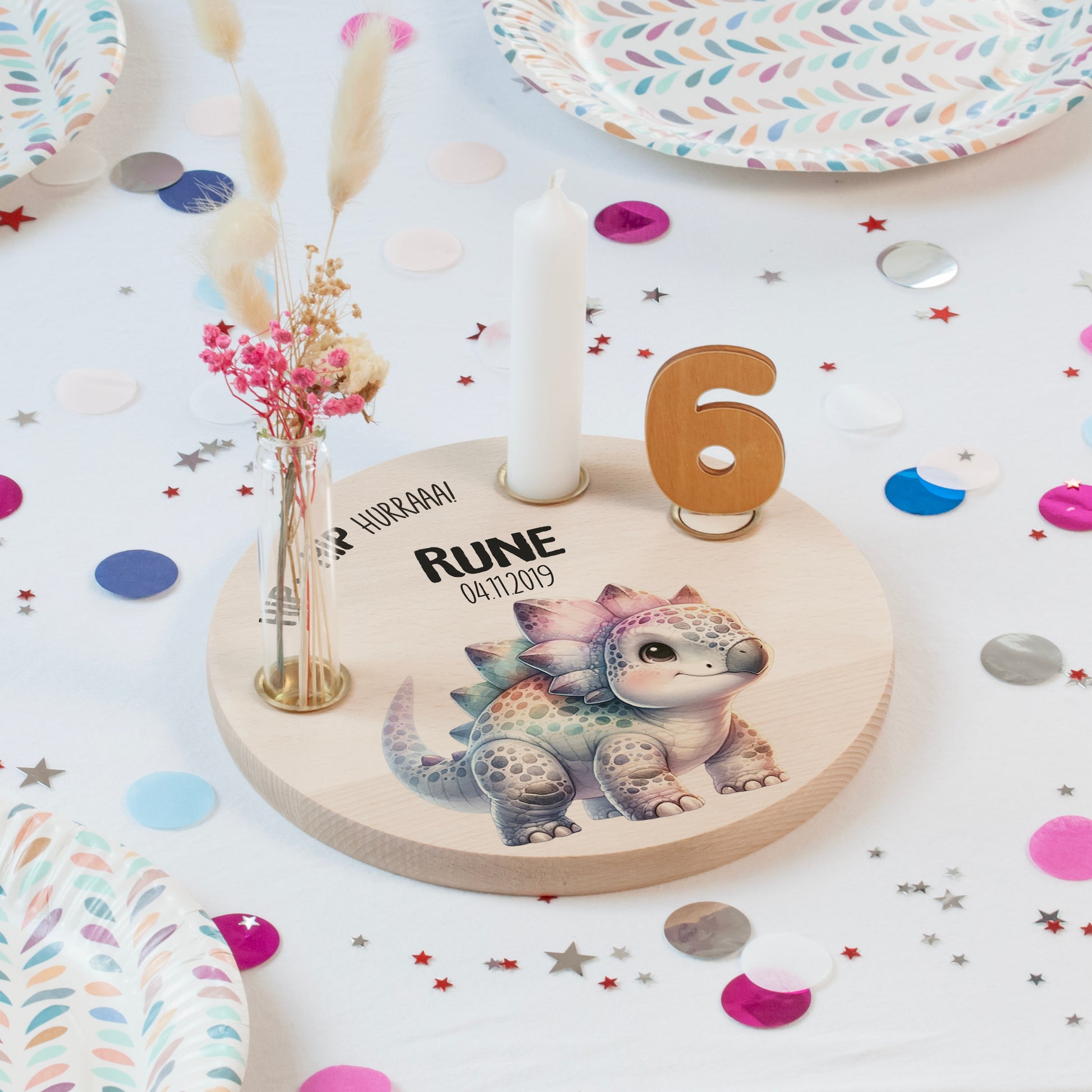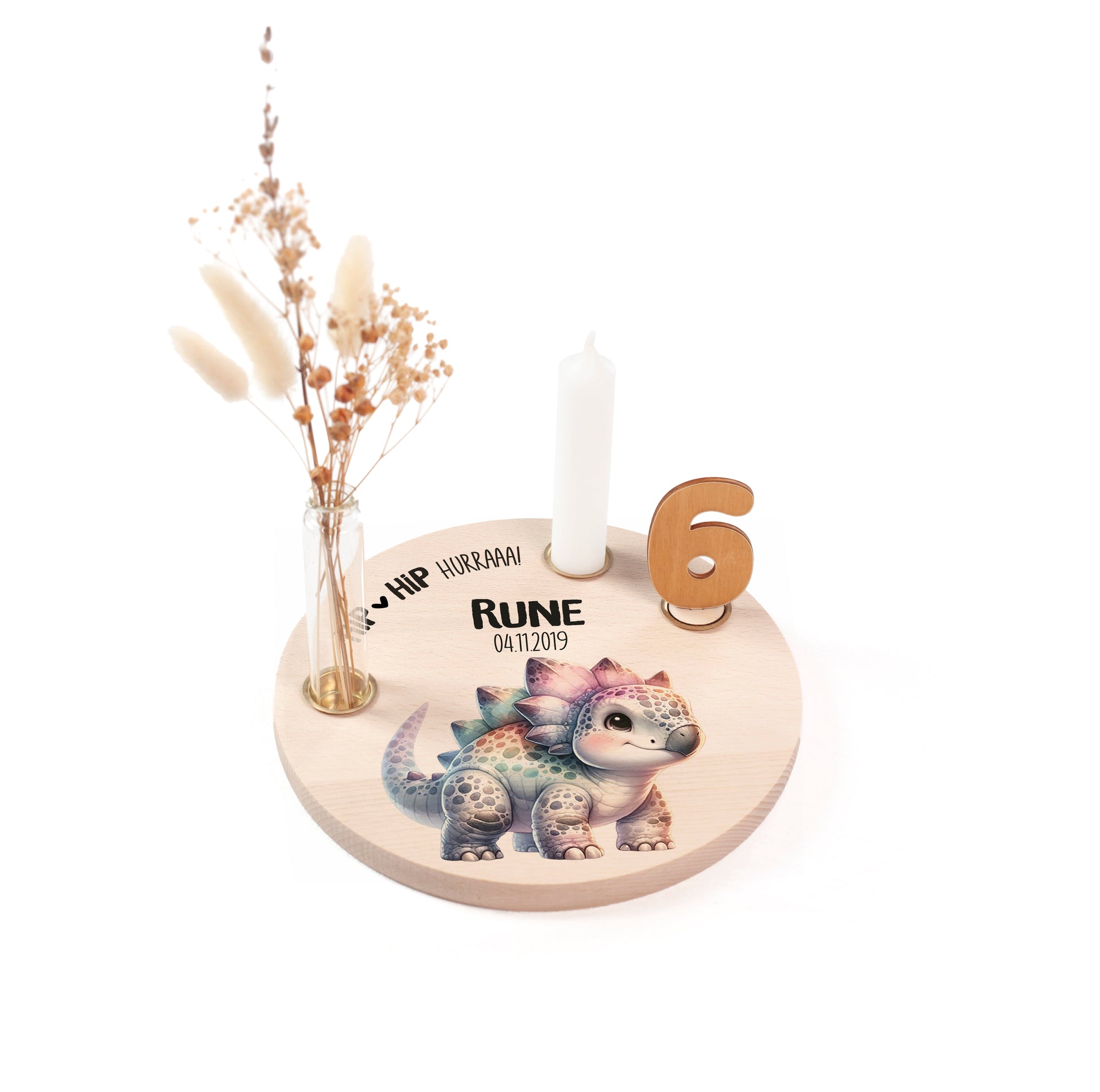 personalisierter Kerzenteller mit Kerze, Vase und Zahlen (Dino 6)
