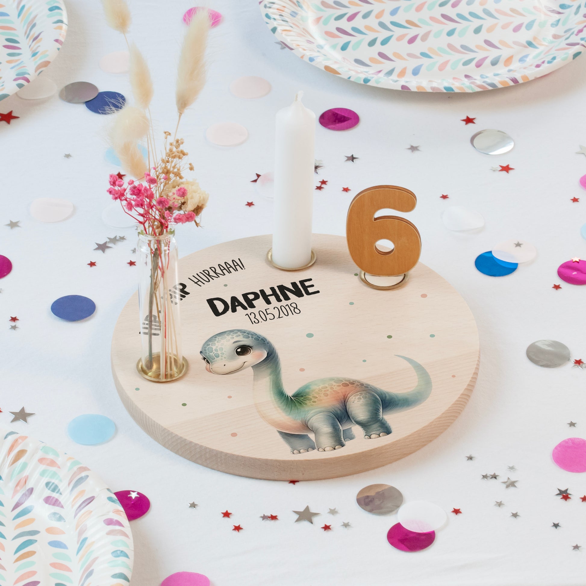 personalisierter Kerzenteller mit Kerze, Vase und Zahlen (Dino 7)