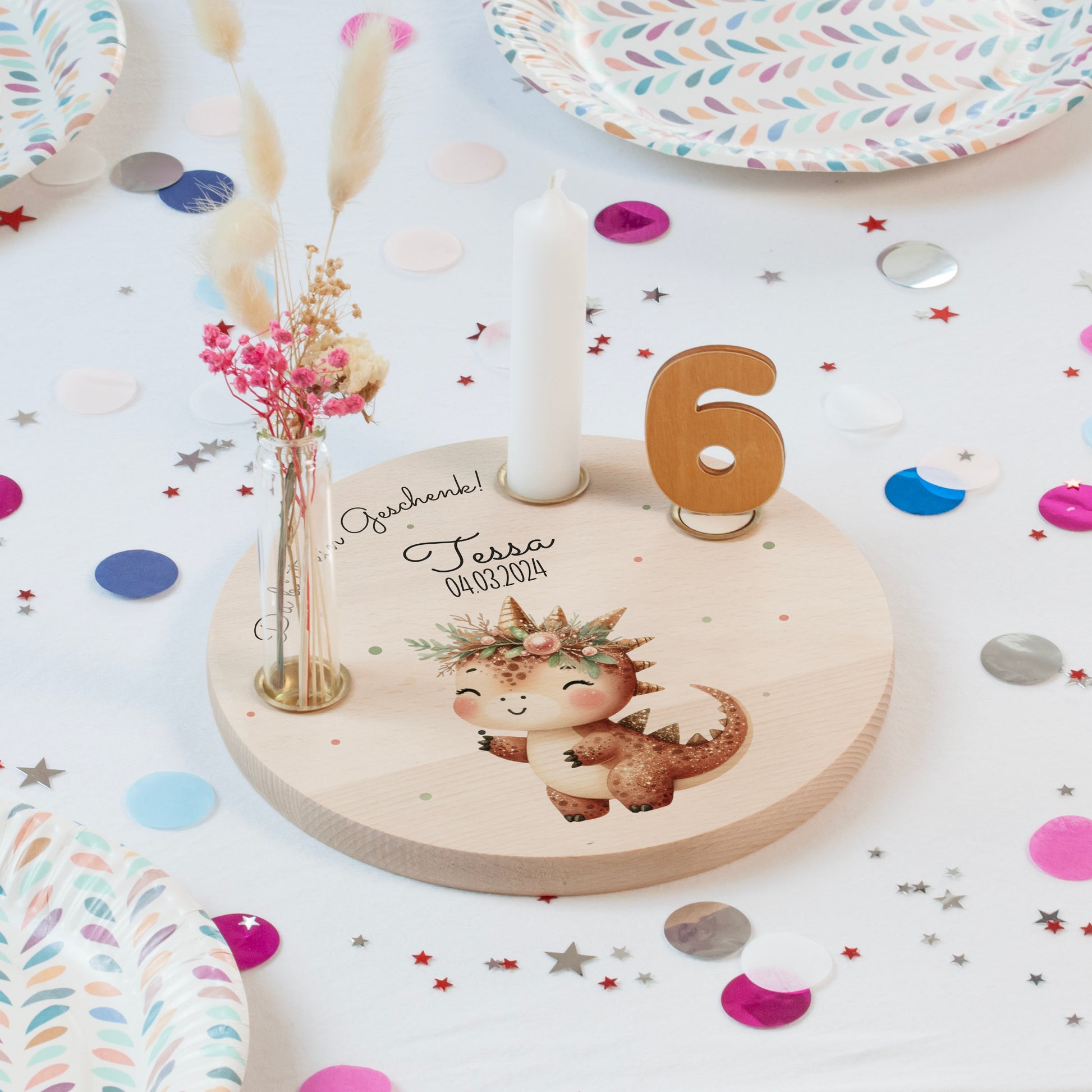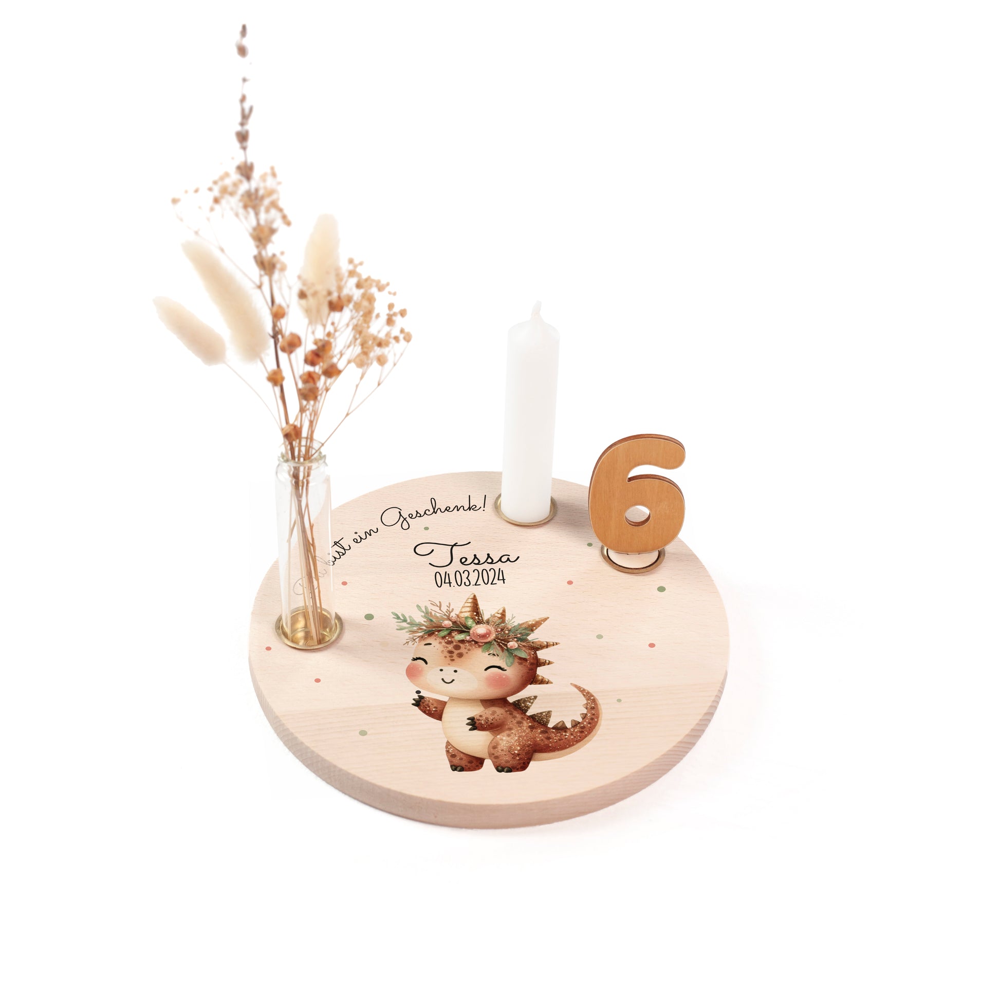 personalisierter Kerzenteller mit Kerze, Vase und Zahlen (Dino 9)