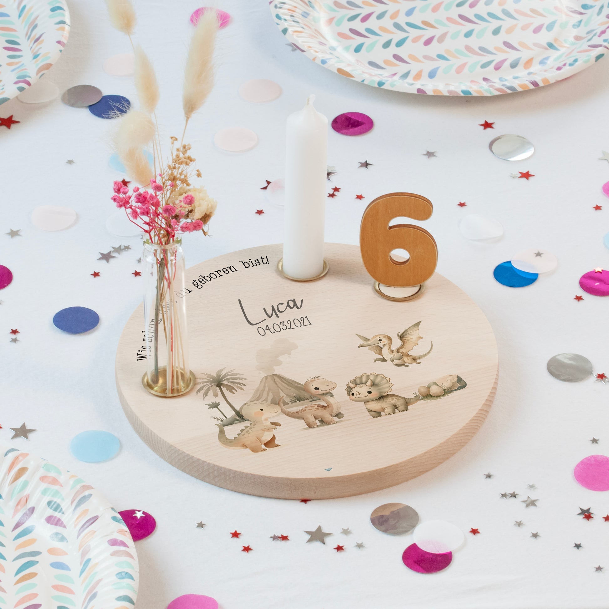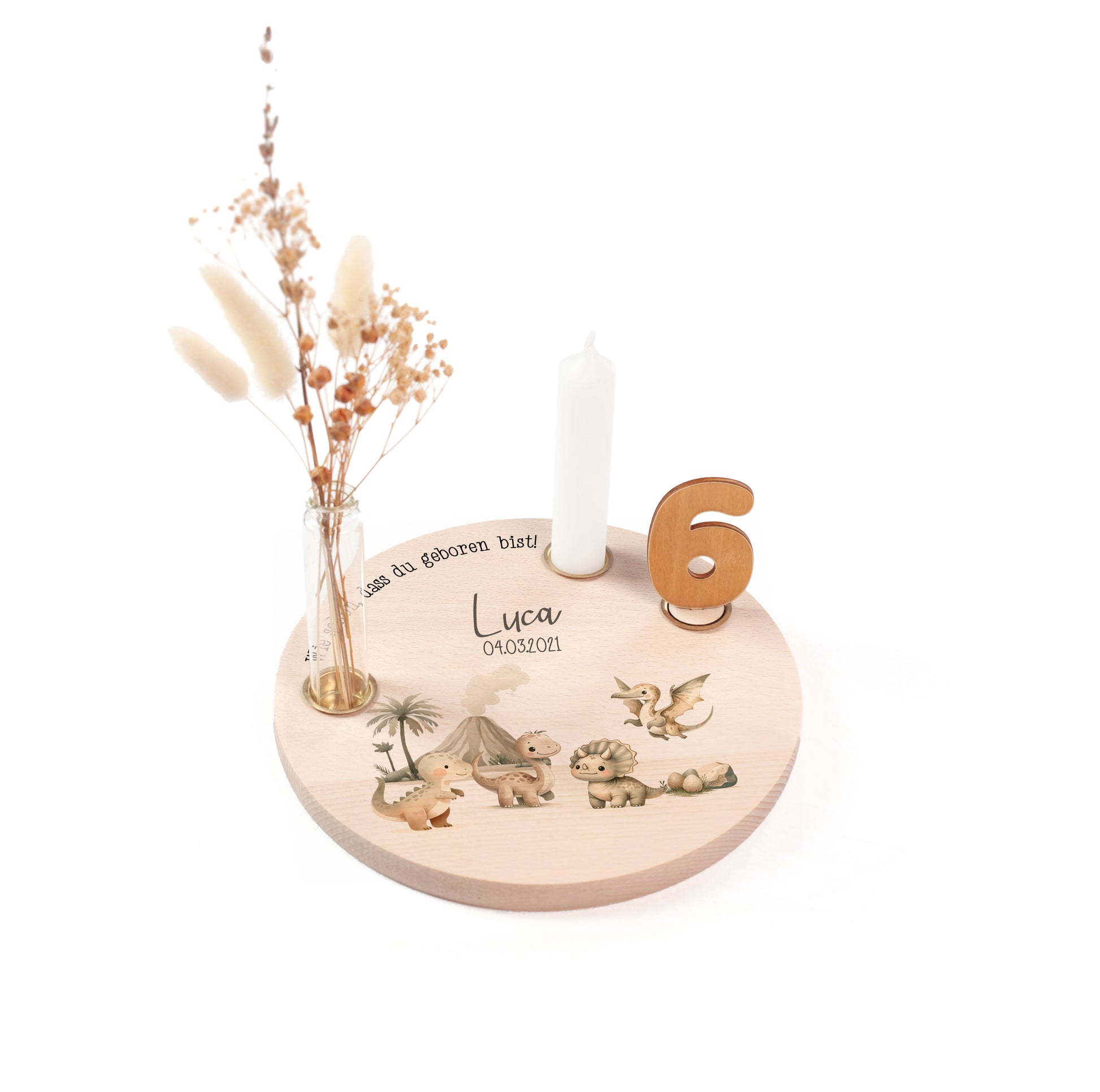 personalisierter Kerzenteller mit Kerze, Vase und Zahlen (Dinowelt)