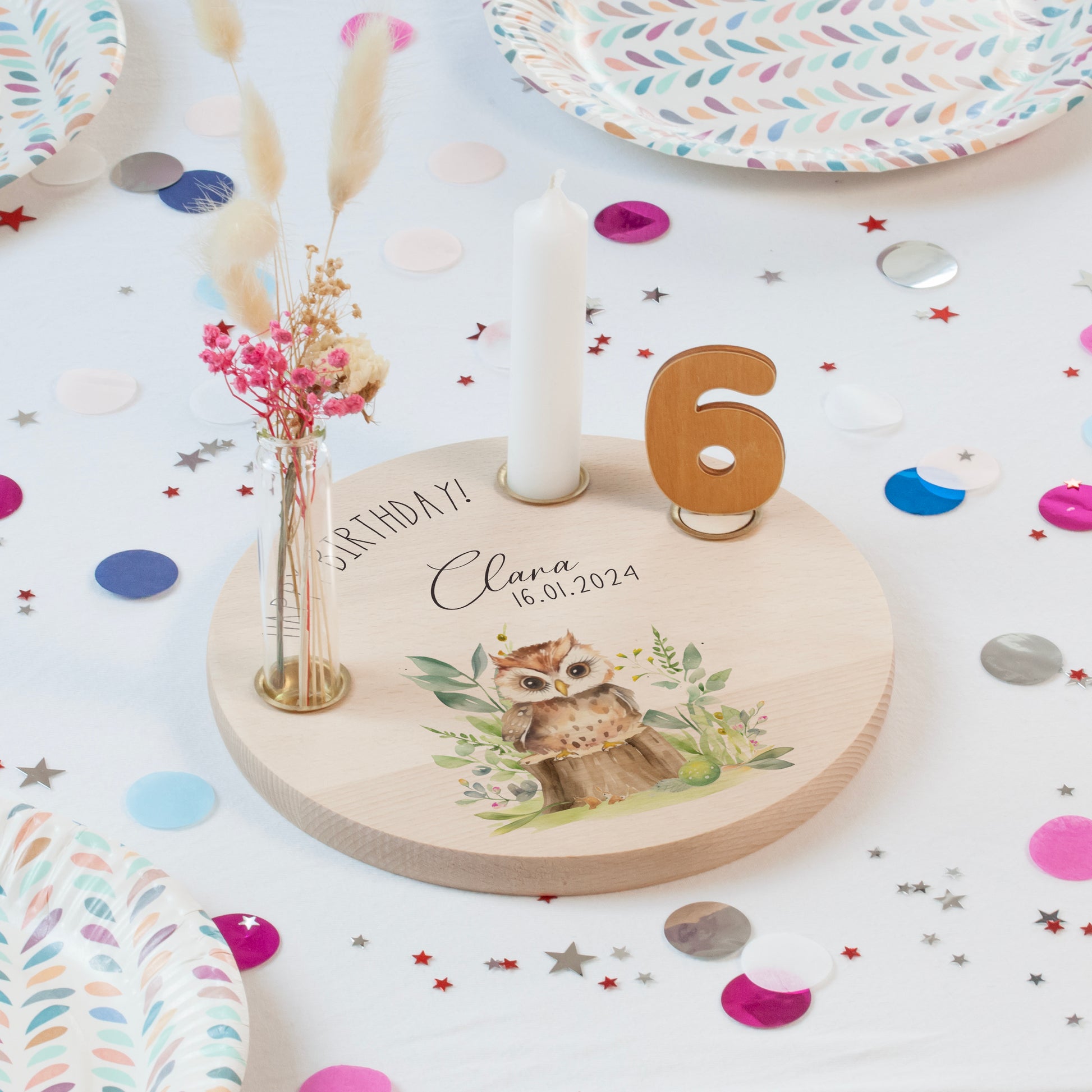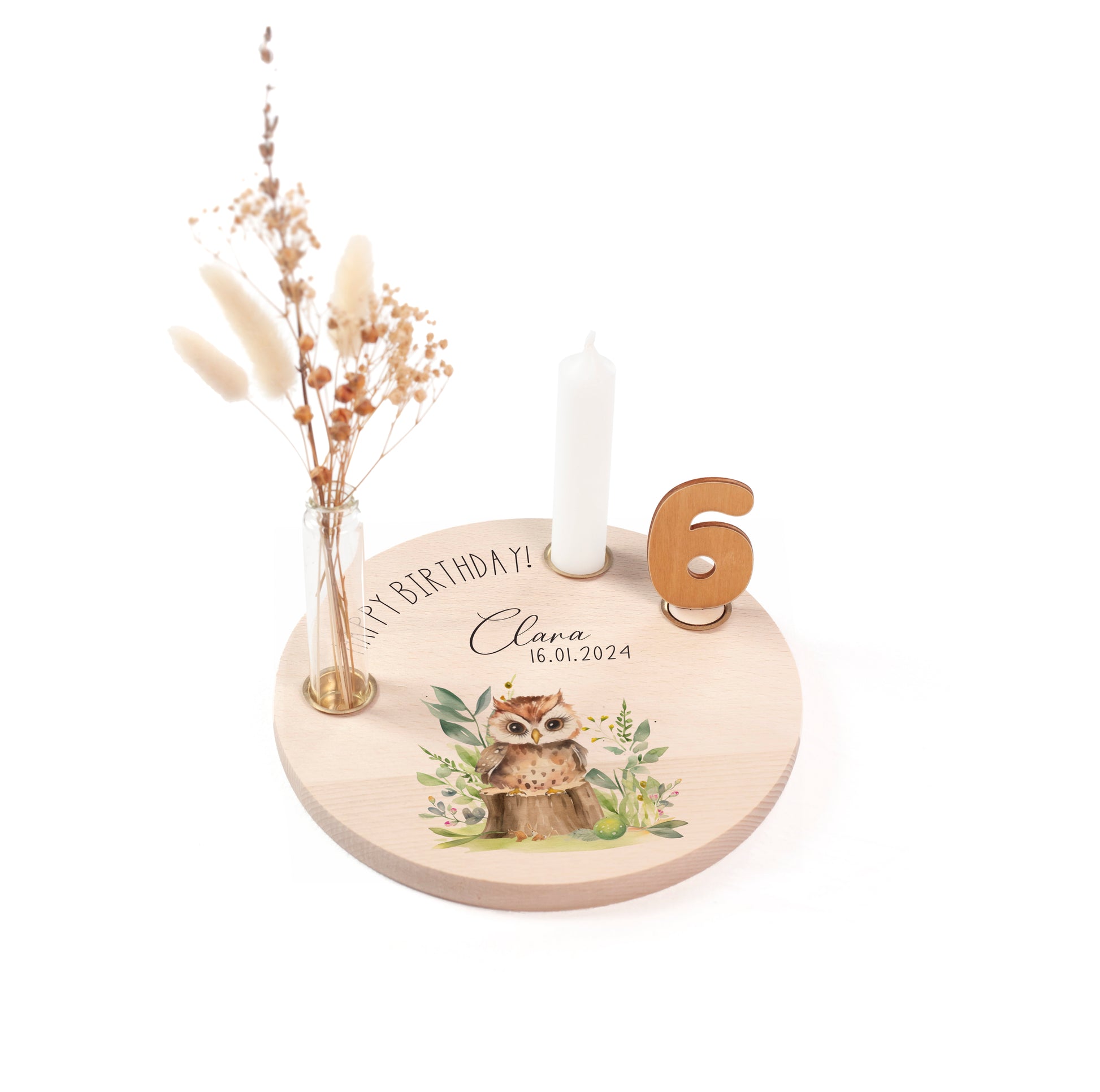 personalisierter Kerzenteller mit Kerze, Vase und Zahlen (Eule 2)