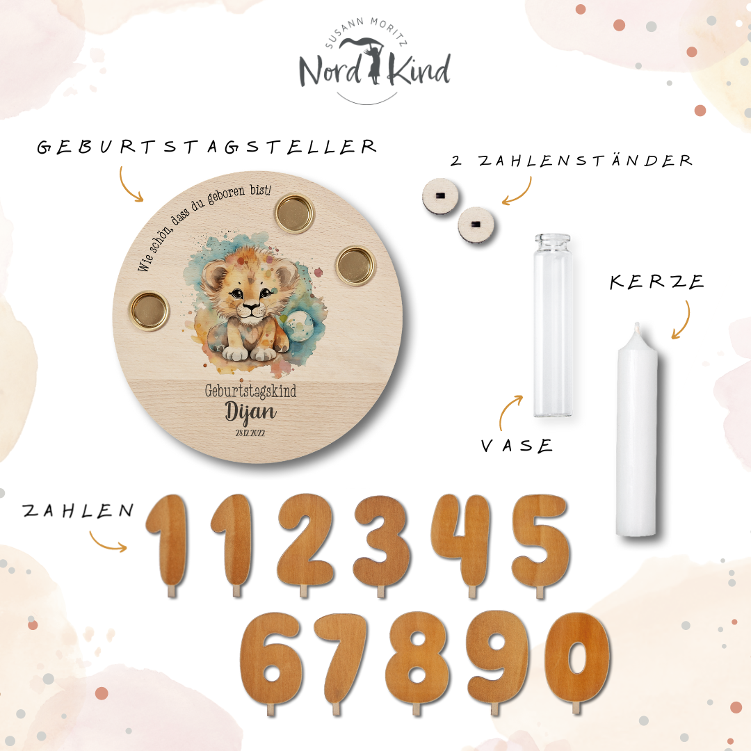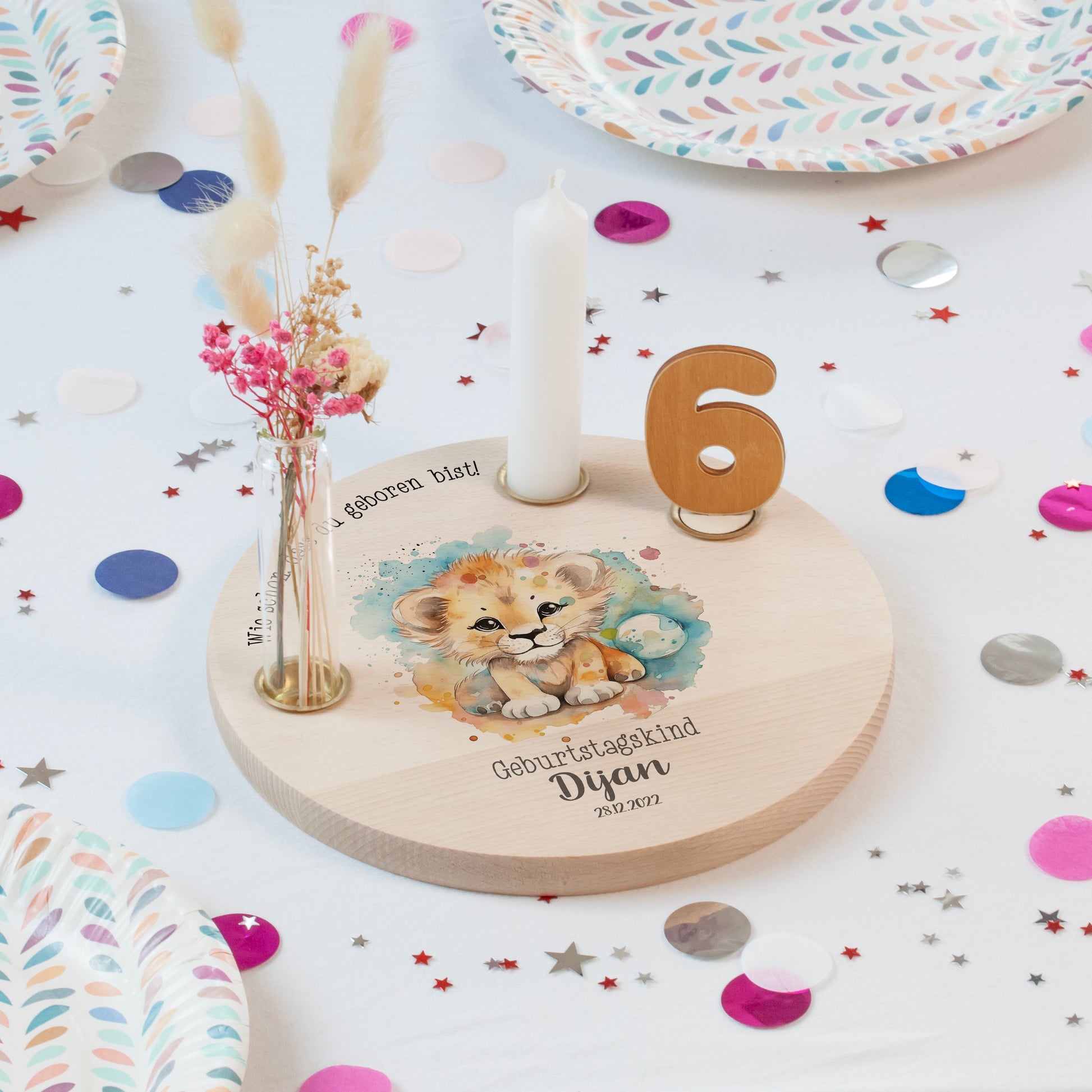 personalisierter Kerzenteller mit Kerze, Vase und Zahlen (Löwe 4)