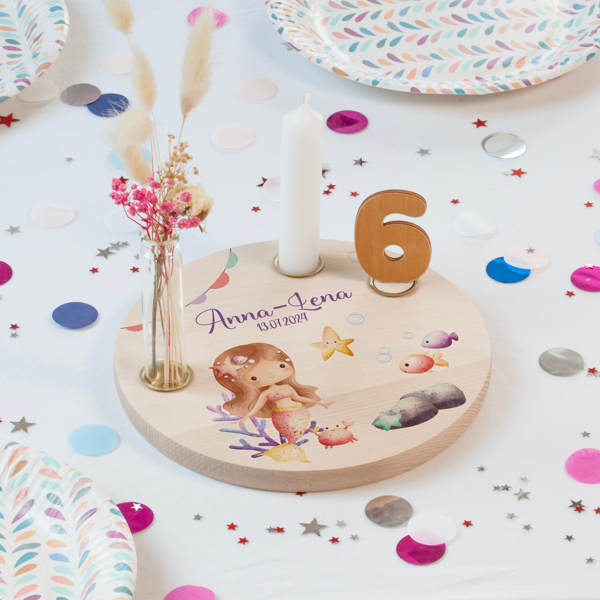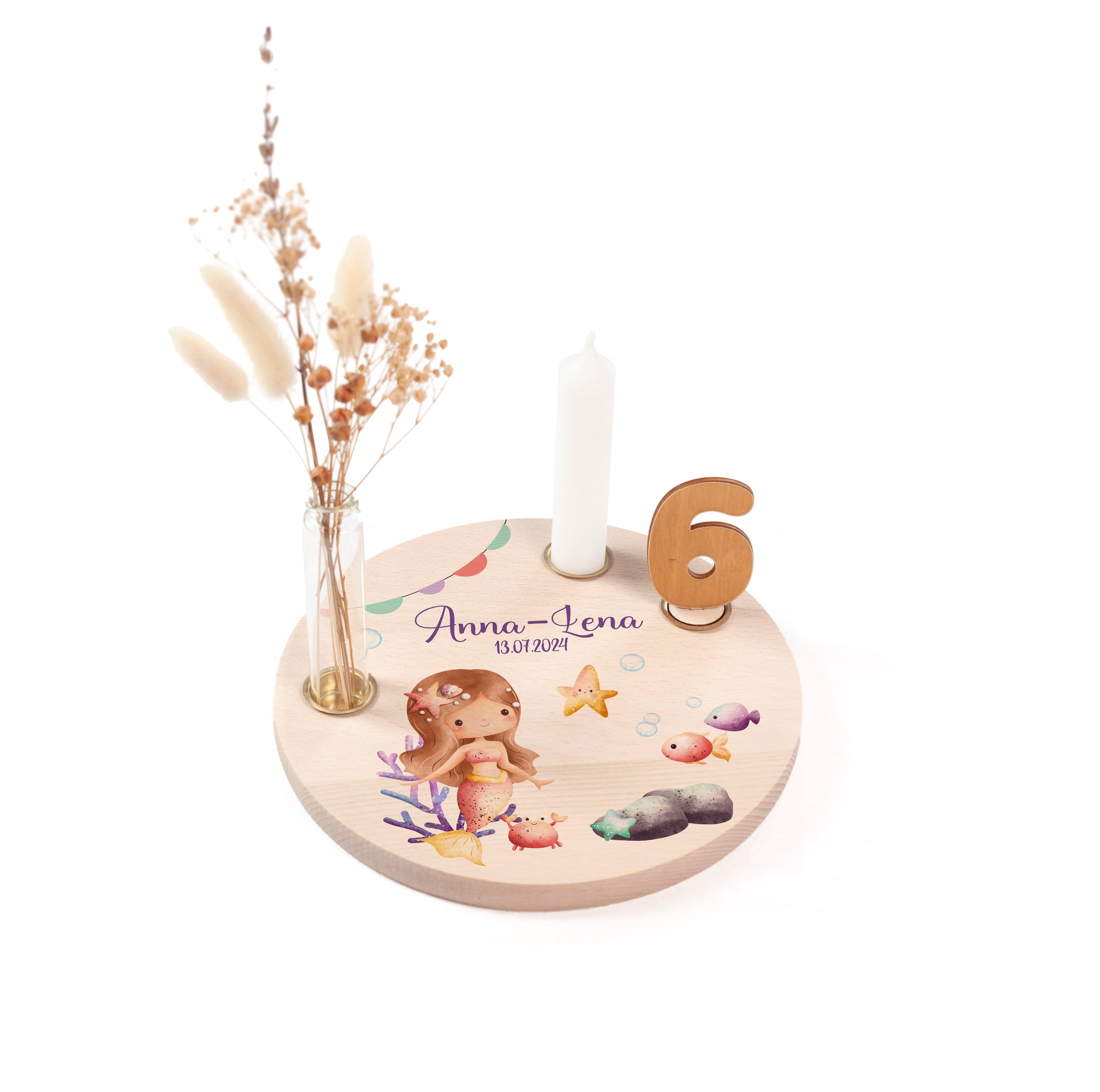 personalisierter Kerzenteller mit Kerze, Vase und Zahlen (Meerjungfrau 2)