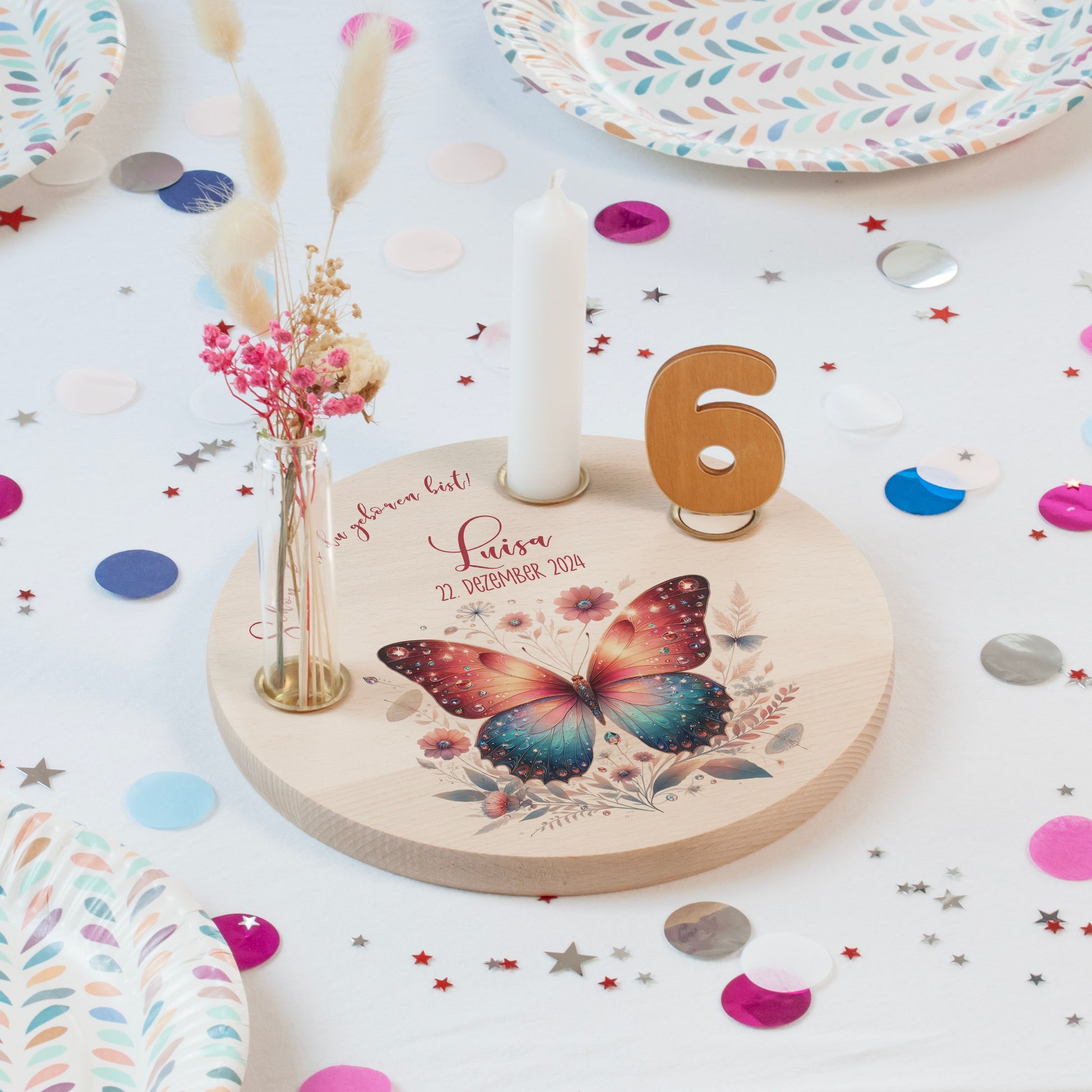 personalisierter Kerzenteller mit Kerze, Vase und Zahlen (Schmetterling 2)