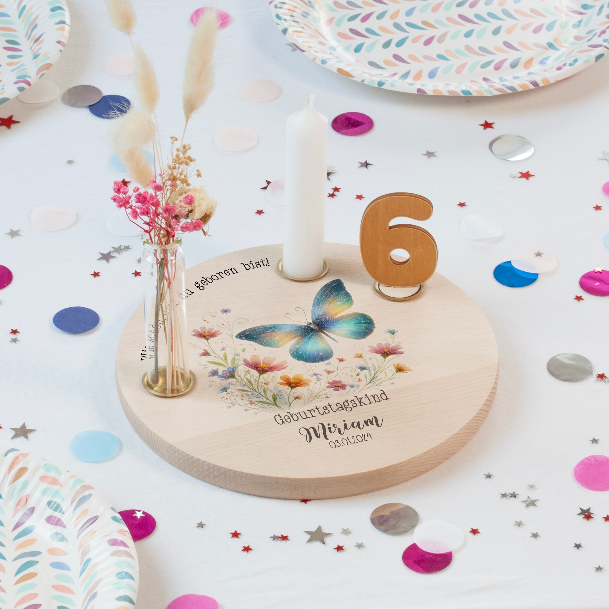 personalisierter Kerzenteller mit Kerze, Vase und Zahlen (Schmetterling 4)