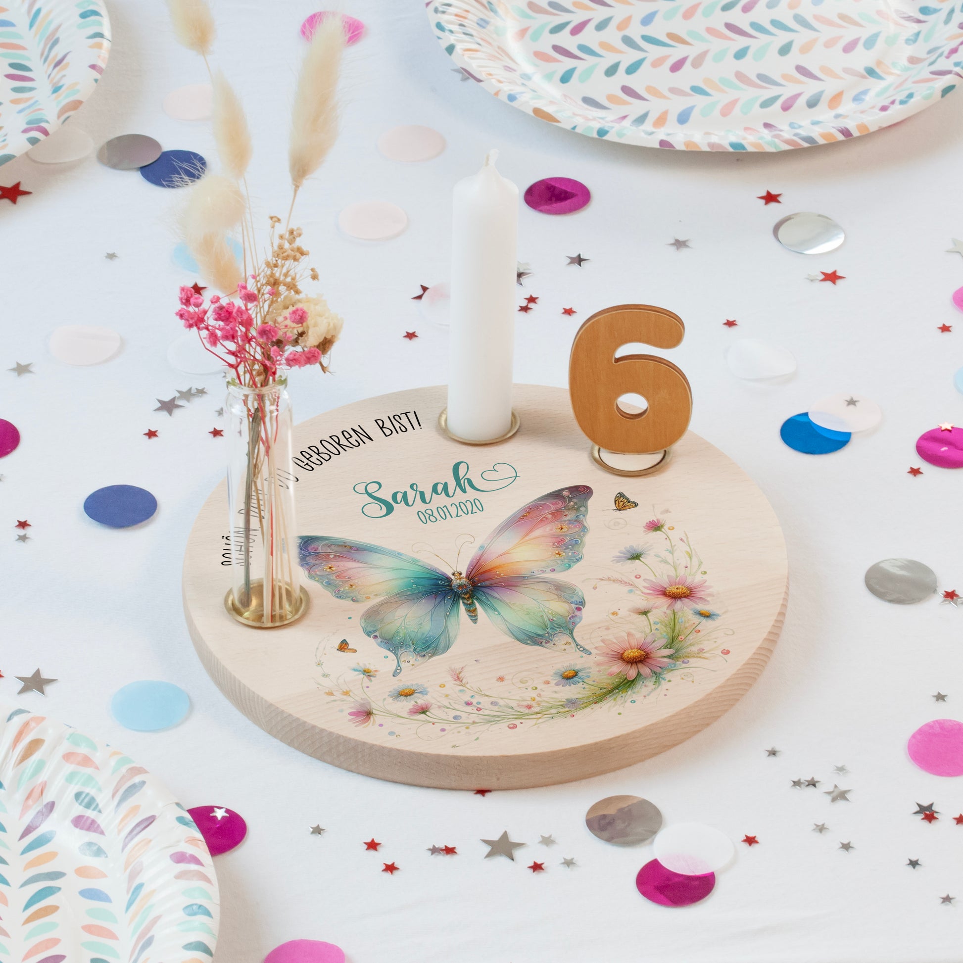 personalisierter Kerzenteller mit Kerze, Vase und Zahlen (Schmetterling 6)