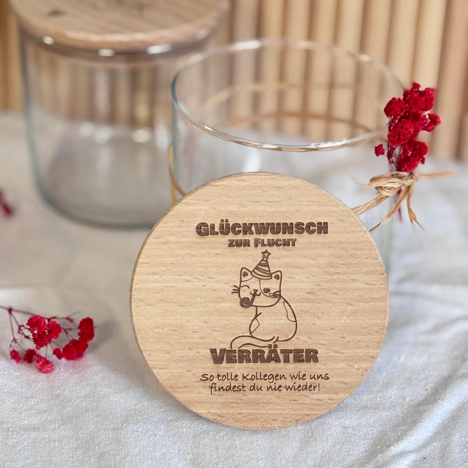 Humorvolles Vorratsglas „Glückwunsch zur Flucht“ als originelles Abschiedsgeschenk für Kollegen / Kolleginnen mit Augenzwinkern.